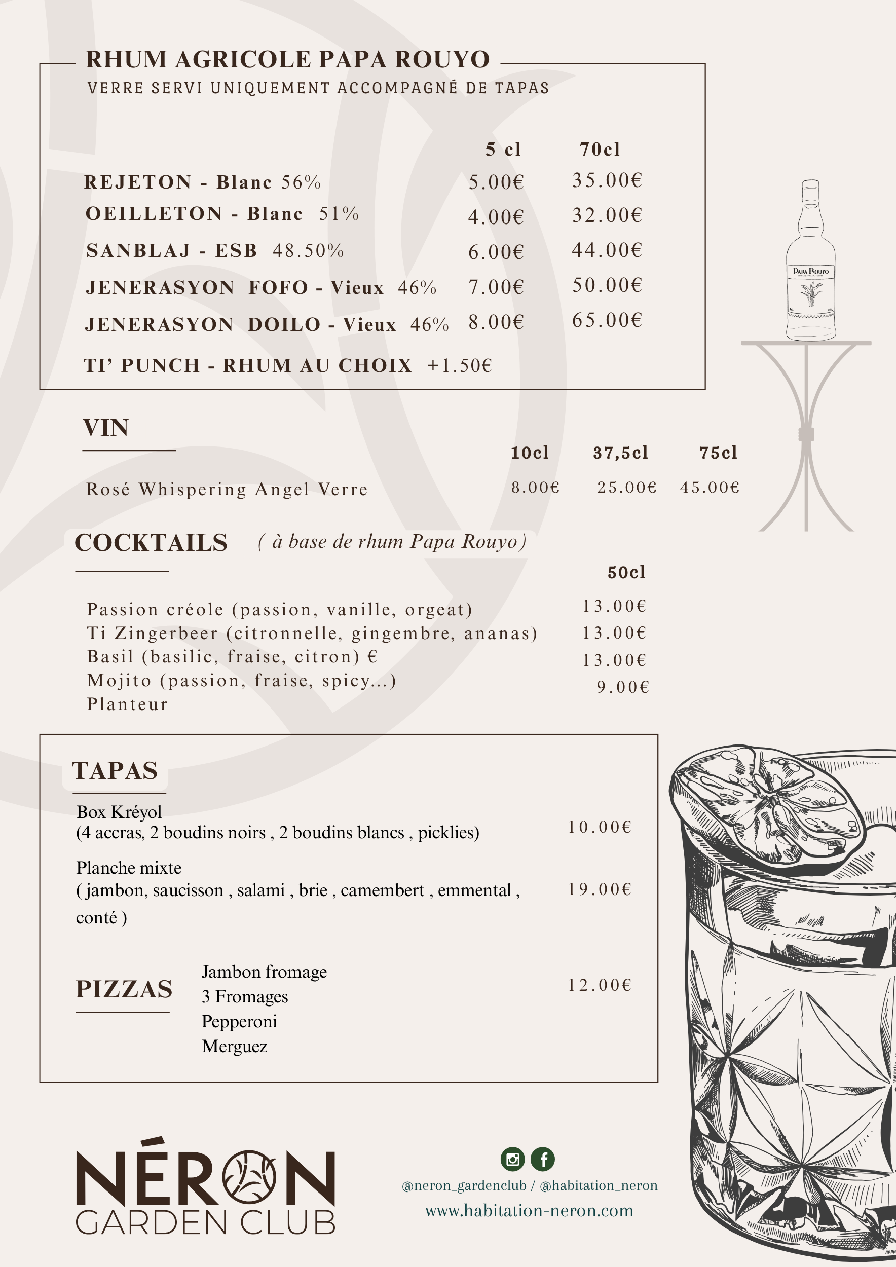 Situé dans le cadre enchanteur de l’Habitation Néron, le Néron Garden Club est une véritable invitation à la déconnexion.Chaque jeudi et vendredi dès 17h, venez savourer des cocktails créatifs dans une ambiance végétale et chaleureuse, rythmée par des DJ sets vibrants et des événements festifs. Un cadre idéal pour se retrouver, partager et célébrer.